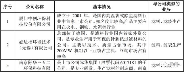 In the domestic market, there are more than 100 fiber and filter media enterprises in the bag dust removal industry, among which small and medium-sized enterprises predominate. After years of development, the company has accumulated a number of stable customers in the domestic market and has a certain market position in the field of filter bags. The company's competitors mainly include.