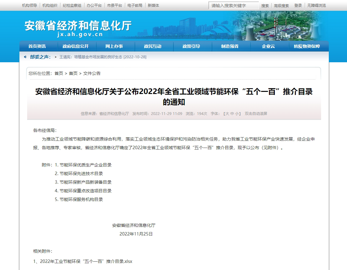 11月29日,安徽省经济和信息化厅公布了2022年全省工业领域节能环保“五个一百”推介目录,乐鱼leyu科技“抗水耐硫脱硝催化剂制备技术”入选“节能环保先进技术”目录,“防静电聚四氟乙烯覆膜滤料”入选“节能环保新产品新装备”目录。