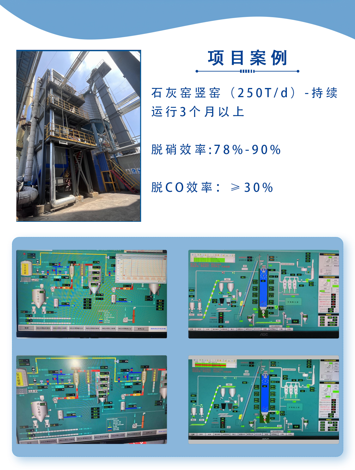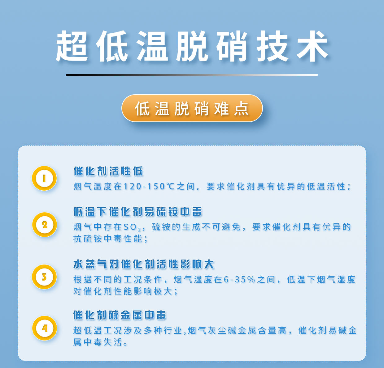 适用工况 低温烟气工况,仅要求烟气温度≥120℃;烟气含水量差异大,可达在10%~40%(vol%);可适应危废焚烧行业、垃圾焚烧行业、白灰行业、钢铁行业工况烟气超低温脱硝;